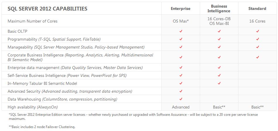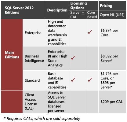 Jelenleg az SQL Server processzor vagy szerver + CAL modellben érhető el, a 2012-es verzió esetében ez megváltozik. Az Enterprise kiadás processzormag (Core) alapon, a Business Intelligence kiadás szerver + CAL modellben, míg a Standard kiadás mindkét modellben elérhető lesz.