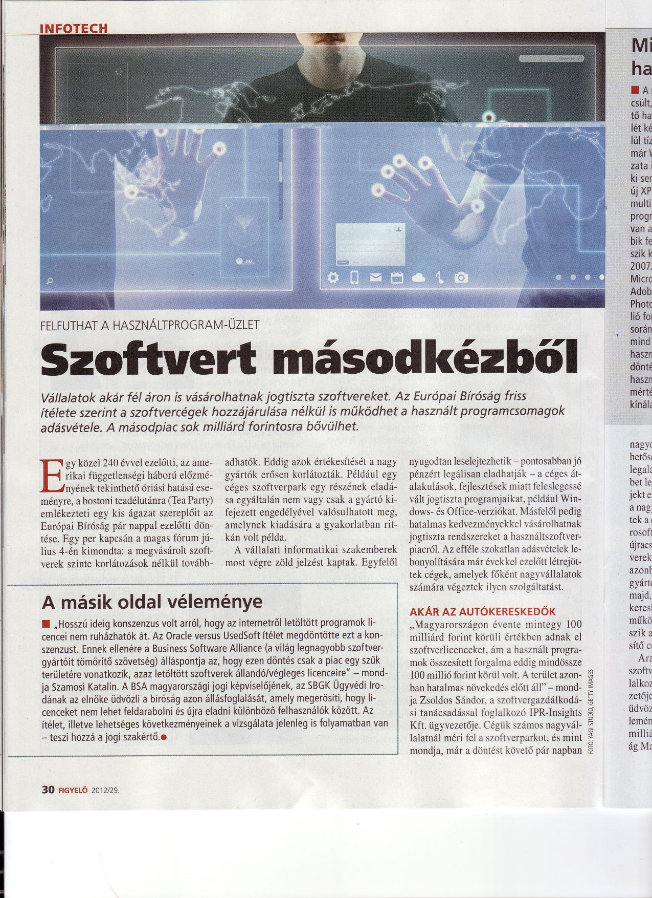 ?Magyarországon évente mintegy 100 milliárd forint körüli értékben adnak el szoftverlicenceket, ám a használt programok összesített forgalma eddig mindössze 100 millió forint körül volt. A terület azonban hatalmas növekedés előtt áll? ? mondja Zsoldos Sándor, a szoftvergazdálkodási tanácsadással foglalkozó IPR-Insights Kft. ügyvezetője. Cégük számos nagyvállalatnál méri fel a szoftverparkot, és mint mondja, már a döntést követő pár napban nagyon sokan érdeklődtek náluk az új lehetőségek iránt. Ez nem is meglepő, hiszen legalább 20-30 százalékot vagy még többet lehet spórolni egy-egy bevezetési projekt esetén a programok árán. Ugyanakkor a nagy szoftveróriások kissé elébe is mentek a döntésnek. A leginkább érintett Microsoft globálisan például már megjelent az újracsomagolt (refurbished) Windows szoftverekkel. A szakember szerint azonban az új helyzetre a nagy gyártók olyan módon reagálnak majd, hogy a használt termékek kereskedelmét beépítik a napi működésükbe, mint ahogy teszik azt például az autóértékesítő cégek is.