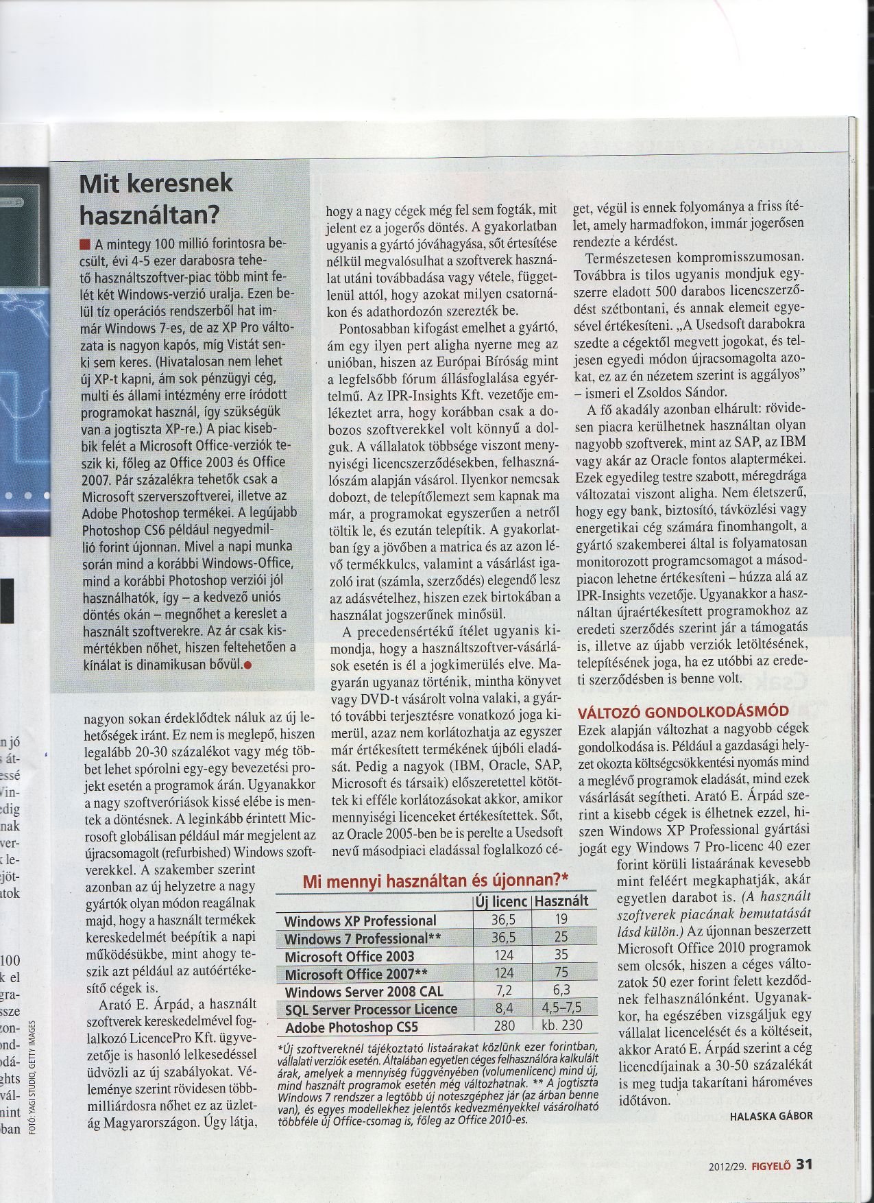 A mintegy 100 millió forintosra becsült, évi mintegy 4-5 ezer darabosra tehető használtszoftver-piac több mint felét két Windows-verzió uralja. Ezen belül tíz operációs rendszerből hat immár Windows 7-es, de az XP Pro változata is nagyon kapós, míg Vistát senki sem keres. (Hivatalosan nem lehet új XP-t kapni, ám sok pénzügyi cég, multi és állami intézmény erre íródott programokat használ, így szükségük van a jogtiszta XP-re.) A piac kisebbik felét a Microsoft Office verziók teszik ki, főleg az Office 2003 és Office 2007. Pár százalékra tehetők csak a Microsoft szerverszoftverei, illetve az Adobe Photoshop termékei. A legújabb Photoshop CS6 például negyedmillió forint újonnan. Mivel a napi munka során mind a korábbi Windows-Office, mind a korábbi Photoshop verziói jól használhatók, így ? a kedvező uniós döntés okán ? megnőhet a kereslet a használt szoftverekre. Az ár csak kismértékben nőhet, hiszen feltehetően a kínálat is dinamikusan bővül.