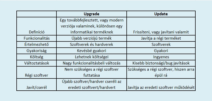 Az update kifejezést teljesen másra használja az informatikai szaknyelv: a meglévő szoftverünkön végzett módosításokat, a gyártó által kiadott javításokat, esetleges funkcionalitások bővítését jelenti.