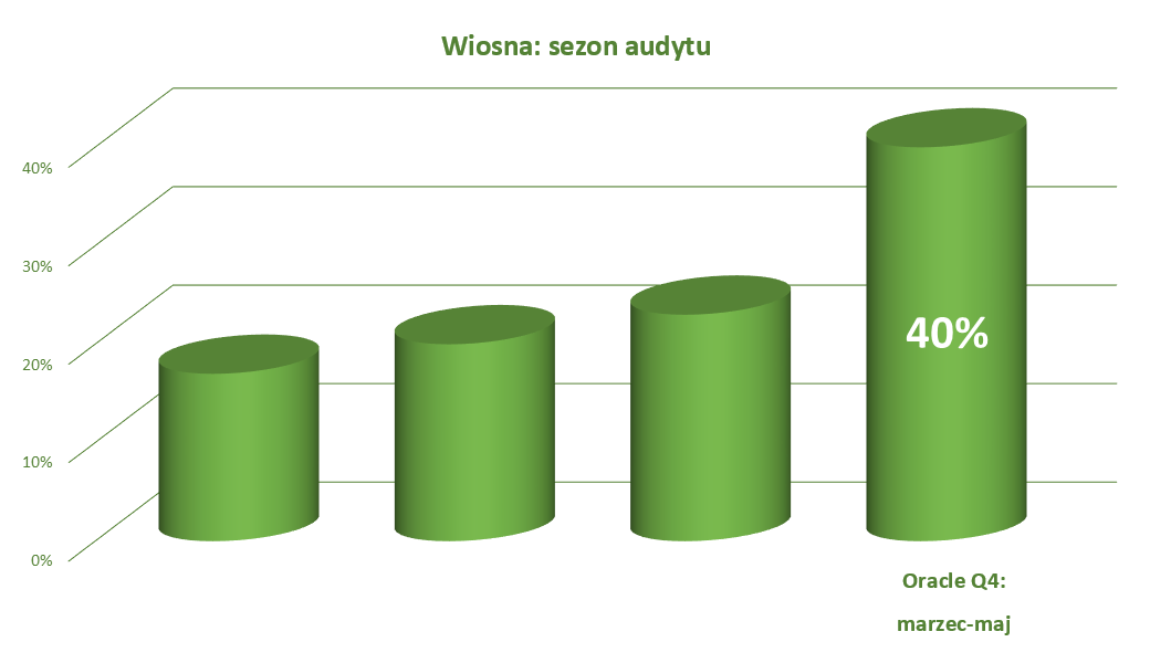 Ostatni kwartał roku obrotowego Oracle przypada na okres od marca do kwietnia-maja i tradycyjnie osiąga 40% rocznych przychodów ze sprzedaży w tym okresie. Coraz bardziej oczywiste jest, że podobnie jak w przypadku innych producentów, audyty oprogramowania są dla Oracle jednym z najpotężniejszych kanałów sprzedaży licencji.