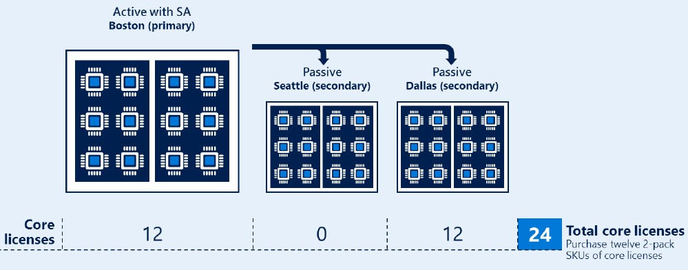 - Exemplu de licențiere a unei baze de date SQL Server primară activă cu Software Assurance (SA) activ și a unei baze de date secundare pasive.